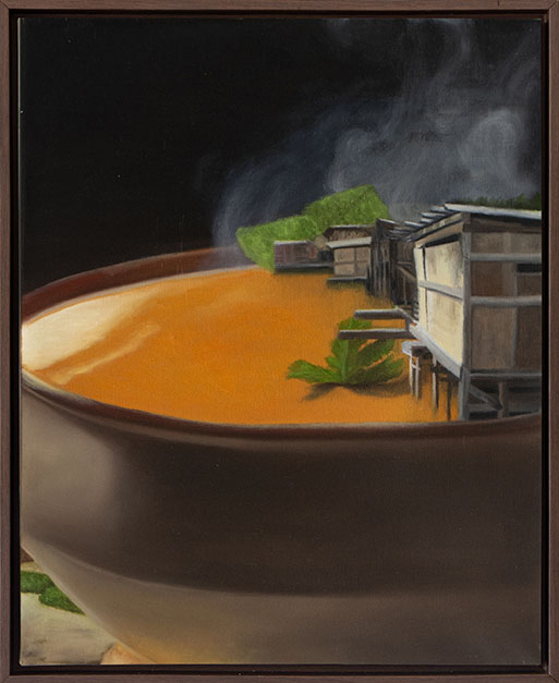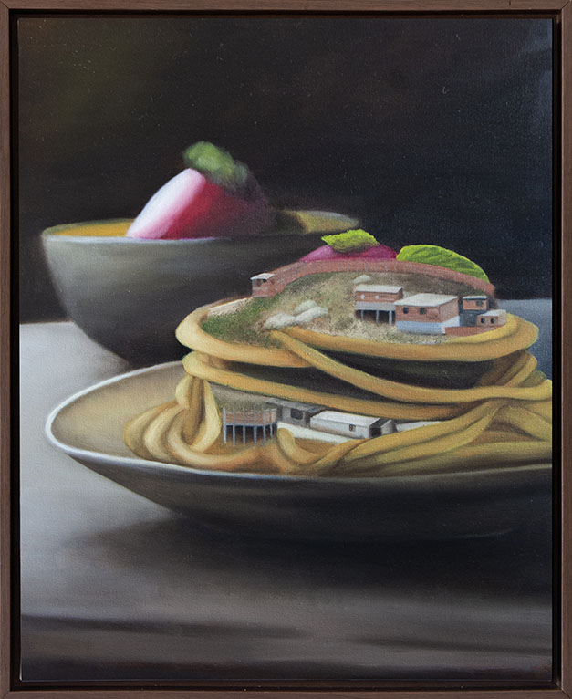A obra compara o formato do prato de macarrão, com sua tendência ao deslizamento quando “engarfado”, às comunidades de morro que vivem o pavor de desabamento.
