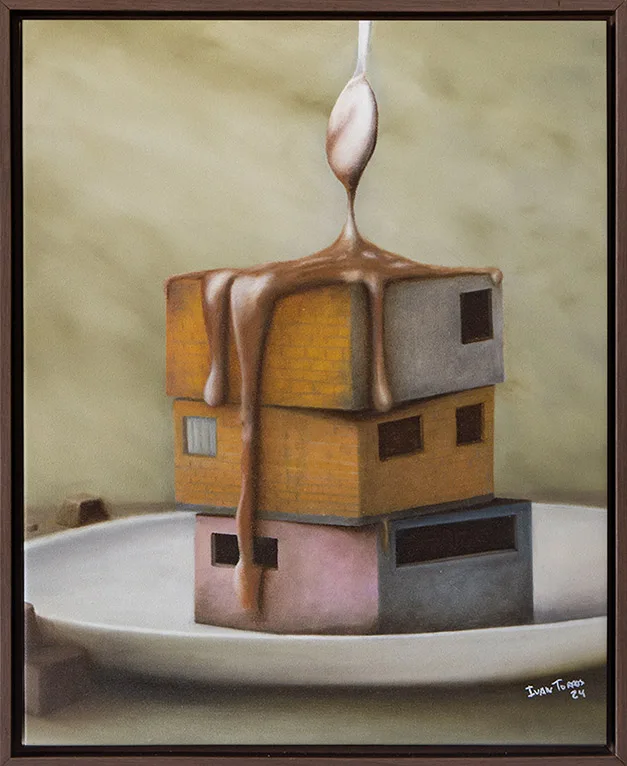 O artista mantém as composições inspiradas em pratos gourmetizados, mas amplia a abordagem para outras questões urbanas, estabelecendo um paralelo com a ilusão digital que nos cerca. A hiperconectividade, muitas vezes, funciona como um véu que encobre e perpetua essas desigualdades estruturais.